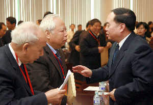 全国普通高等学校本科教学评估工作经验交流暨评估专家组组长工作研讨会4月18日在北京举行。图为教育部部长周济在和会议代表交谈。本报记者 高海涛 摄