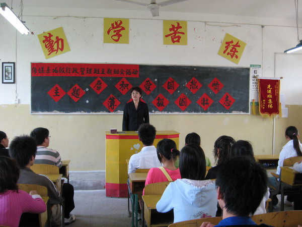 活动再现 4月21日,鄂州大学传媒系2006级行政管理班在该校一号教学区301教室召开了一场名为“厚积爱国热情 薄发报国壮志”的主题班会活动。班会由鄂州大学传媒系党支部书记、系主任陈静主持。