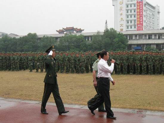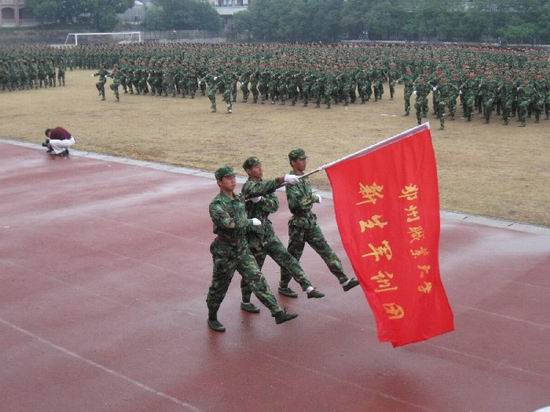 9月26日伴着绵绵秋雨我校08级新生军训汇报表演拉开了序幕,上午9:00我校1号教学区体育场上士气高涨,3000余名08级新生统一装着迷彩装,个个精神抖擞,随时准备着给大家展示他们20天来的军训成果。