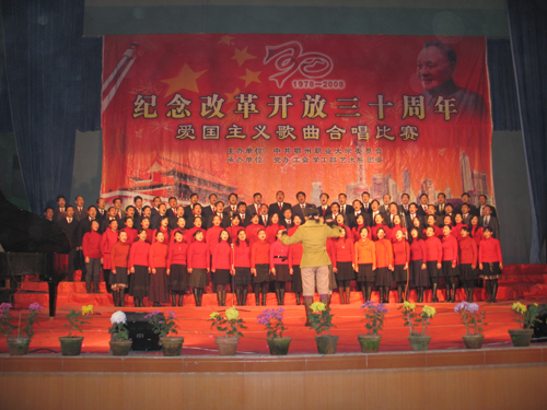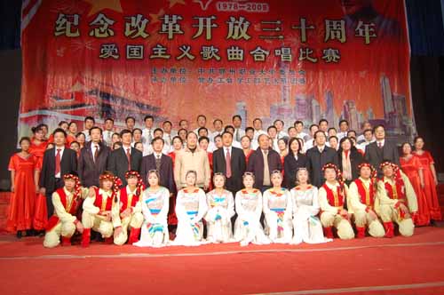 为隆重纪念我国改革开放30周年,讴歌社会发展的辉煌成就,12月8日晚,由我校党委主办,党办、工会、学工处、艺术系、团委五个部门共同承办的“鄂州职业大学纪念改革开放30周年爱国主义歌曲合唱比赛”于艺术楼礼堂隆重举行。副市长李莹、市委宣传部副部长熊友云、市政府副秘书长胡楚平、团市委书记黄立楣莅临观看,校党委书记彭有轩致开幕词。