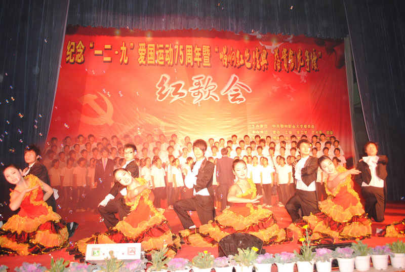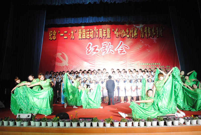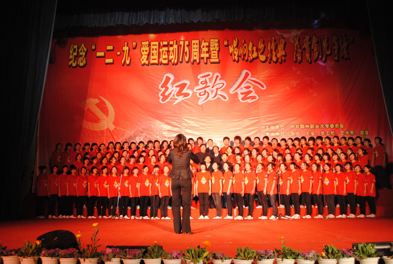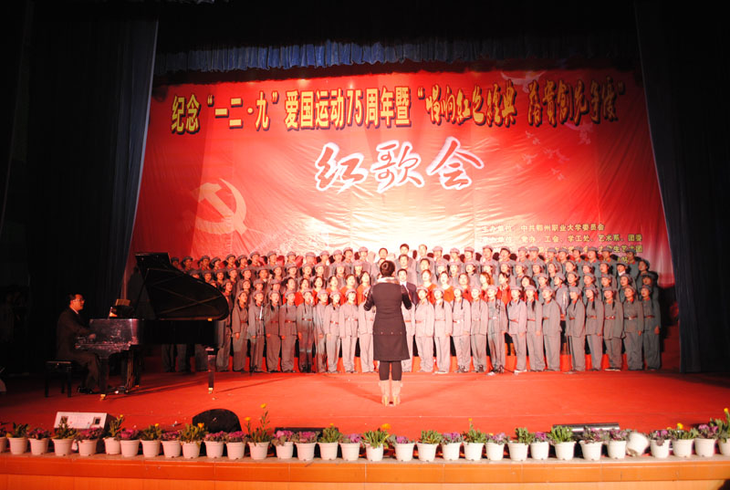 为纪念“一二·九”青年爱国学生运动75周年,并推进我校“创先争优”活动深入开展,12月9日晚,我校隆重举行“纪念‘一二·九’爱国运动75周年暨‘唱响红色经典,落实创先争优’”红歌会。