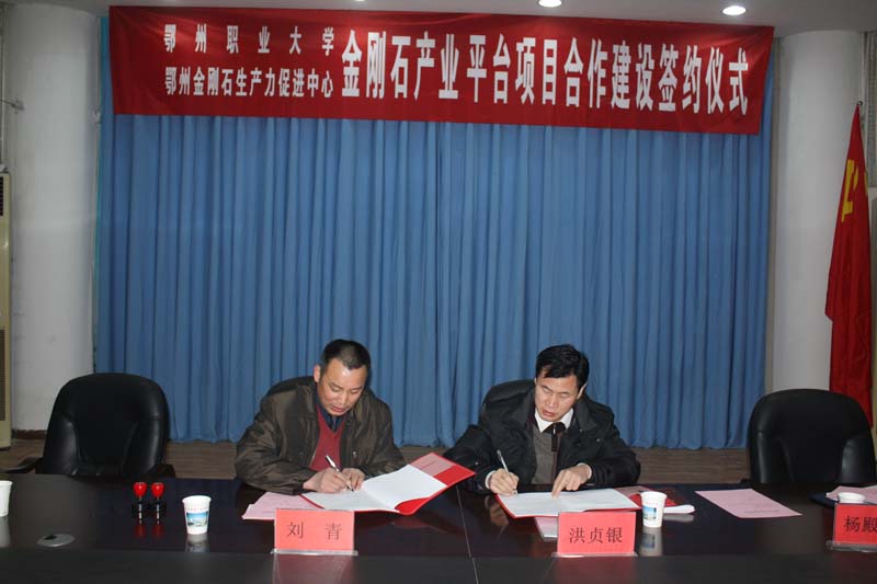 1月18日上午,湖北省金刚石生产力促进中心与我校合作建设的省金刚石产业平台项目在学校图书馆一楼会议室正式签约,省金刚石生产力促进中心主任、省长江精工材料技术有限公司董事长刘青当即将作为启动经费的五万元(该项目建设经费为10万元,余下的五万元也将陆续到账)交与我校,校党委副书记、副校长洪贞银发表热情洋溢的讲话,系主任熊裕文主持签约仪式,校教务处长杨殿生、系副主任李年芬、系办主任刘真喜、金刚石教研室主任刘全心及该项目组成员等参加了签约活动。