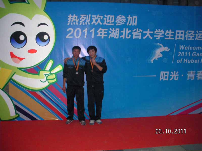 在10月份举行的“2011年湖北省大学生田径运动会”上,我校派出的以魏巍、章亮、孙博艺、胡洋、王龙等6名健儿组成的代表队奋勇拼搏,分别在参加的七个田径项目中获得了一个冠军、两个亚军,一个季军、一个第四名和男子团体总分第四名的好成绩。