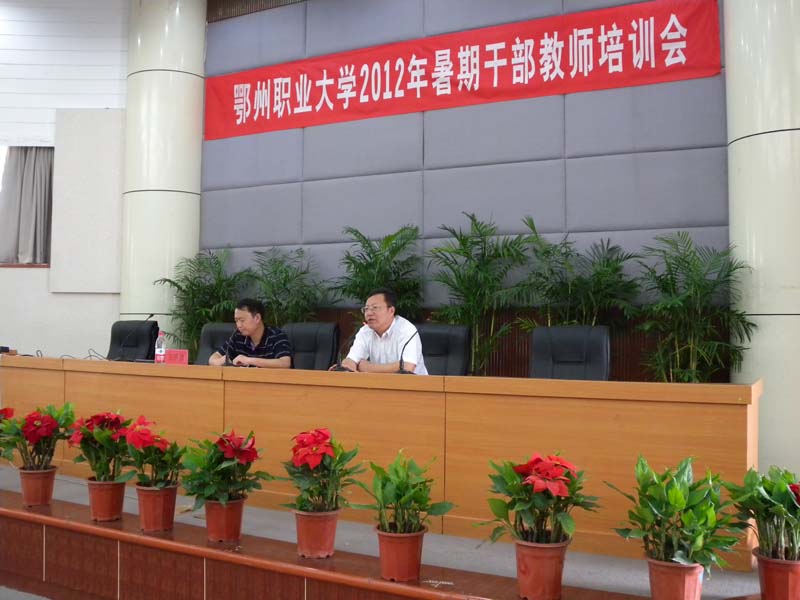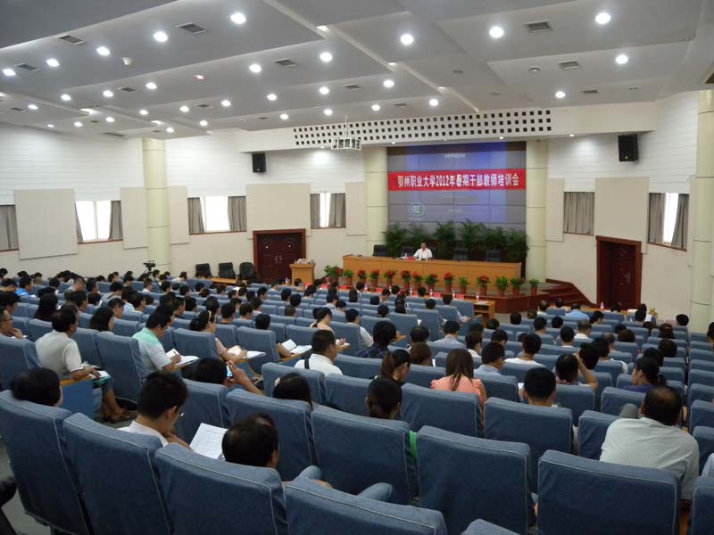 8月25日,为期四天的我校2012年暑期干部、教师系列培训活动在图书馆学术报告厅开班。当天,省高工委组织处处长肖慎钢、省教育厅纪检处处长王洪波和武汉大学孙来斌教授分别就党的建设、惩防体系建设和世界现代化进程中的中国模式等内容,为我校副科级以上干部、全校辅导员、机关工作人员和后勤集团中层以上管理人员做了精彩的专题讲座。 培训活动期间,我校还邀请到了全国著名职业教育专家陈解放、武汉纺织大学副校长彭育园、武汉船舶职业技术学院院长熊仕涛来校做学术报告,内容涉及骨干高职院校建设、提升大学科学管理水平、职业教育和政策解读等多个方面。此外,解读我校国家骨干高职院校建设方案,部署校国家骨干高职院校建设工作,教师代表进行说专业和说课示范,学员展开学习交流也是此次培训的重要内容之一。