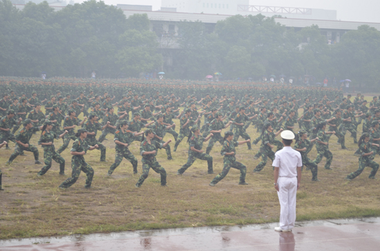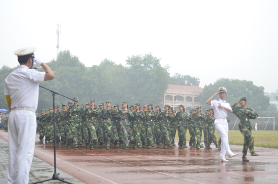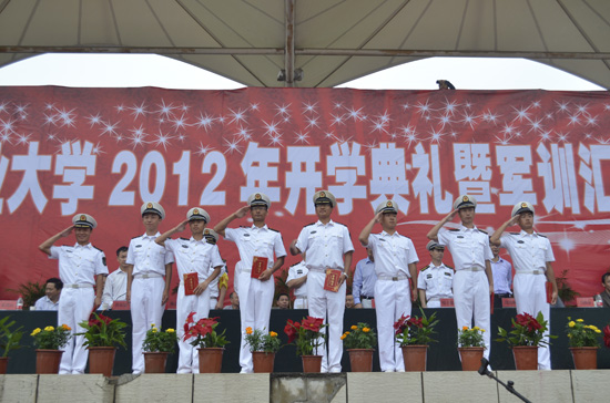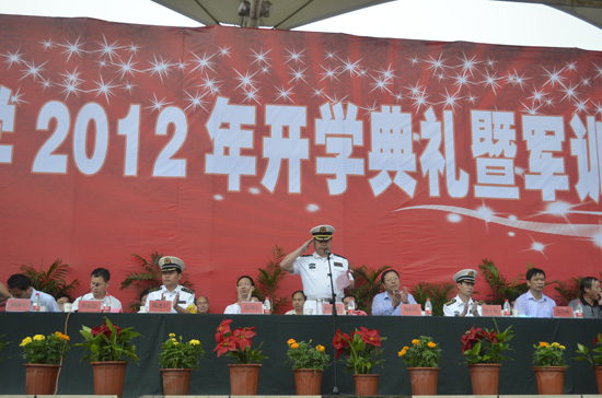 9月21日上午,我校2012年新生军训汇报表演在西校区体育场举行。海军工程大学训练部部长高敬东少将、俞子敬大校及校领导班子成员出席汇报表演。