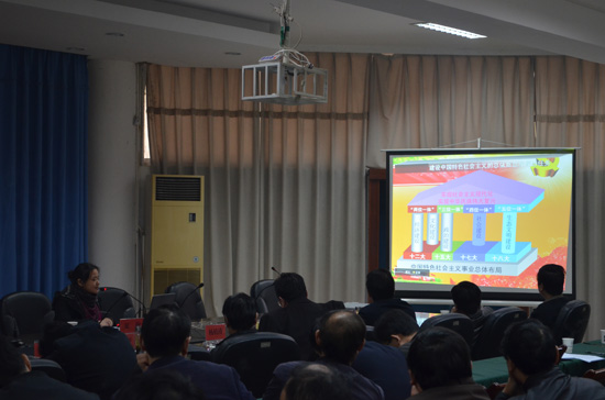 11月29日下午,校党委中心组在学术报告厅一楼举行学习(扩大)会,专题学习贯彻党的十八大精神。此次理论学习邀请社科部夏澈副教授作辅导报告,校领导班子成员,各院系、处室及直属单位负责人参加学习,副校长童长江主持会议并作总结发言。 夏澈副教授从“科学发展观”定“指导” 、“全面建成小康社会”定“目标”、 “不走老路邪路”定“道路”、 “加快转变发展方式”定“质量”、 “建设美丽中国”定“战略”和 “加强党的纯洁性建设”定“保证”等六个方面对十八大精神进行了全面的解读。