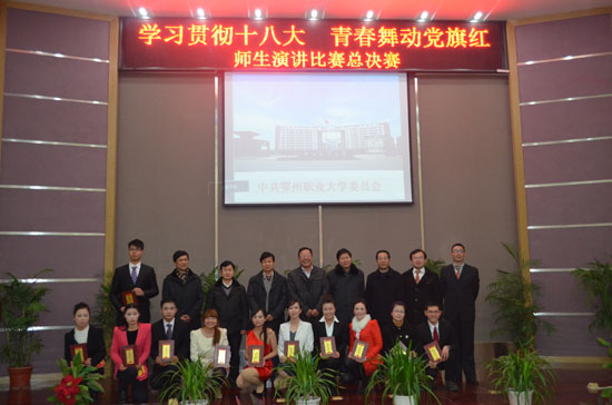 12月26日晚,由校党委组织部举办的“全面贯彻十八大精神”师生演讲总决赛在求真楼学术报告厅落下帷幕。中职学院陈艳老师获得教师组第一名,建工学院王刚刚同学获得学生组第一名。