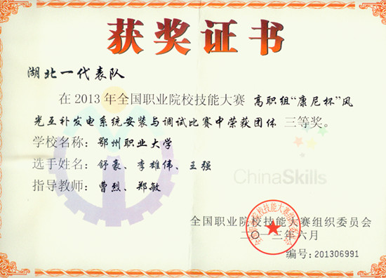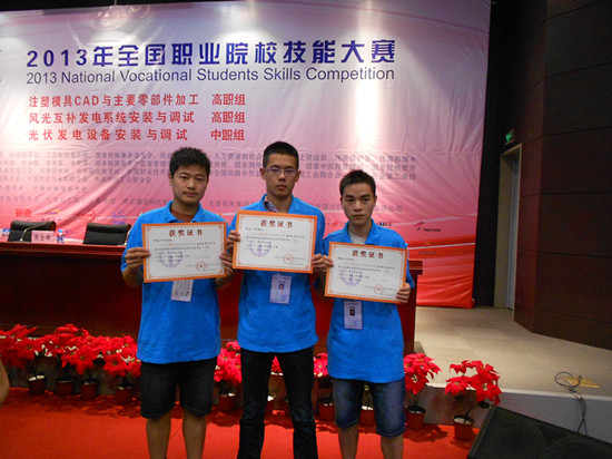 6月27日,2013全国职业院校技能大赛在天津举行,我校代表队参赛的“风光互补发电系统安装与调试”项目荣获团体三等奖,为我省首获该项目国赛奖项。
