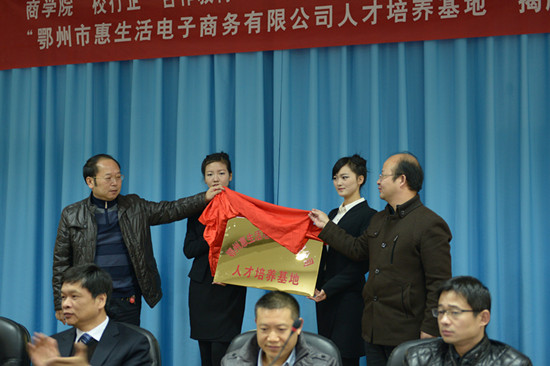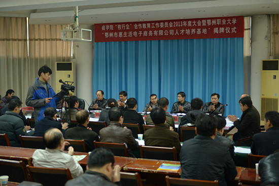 12月6日下午,商学院“校行企”合作教育工作委员会2013年度大会在校学术报告厅一楼会议室召开,会上举行了鄂州职业大学“鄂州市惠生活电子商务有限公司人才培训基地”揭牌仪式。