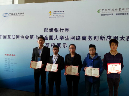 2014年12月1日,在北京邮电大学举行的“邮储银行杯”第七届大学生网商大赛全国总决赛中,我校商学院电子商务专业储乐e族团队(队长顿世康、成员张文安、王瑾、秦梦晶、吴欢)取得了网络金融与支付主题赛二等奖。