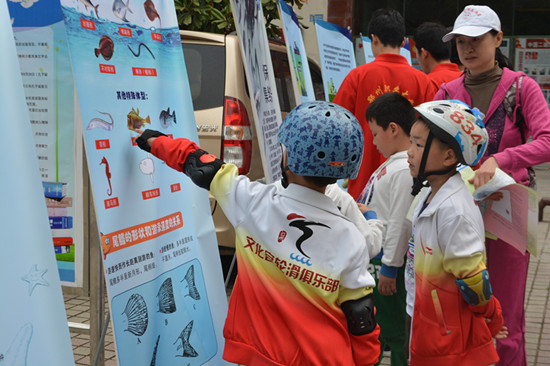 活动现场吸引了不少市民尤其是小朋友的目光,他们颇有兴趣地观看了活动现场摆放的中华鲟保护知识展板,并热情积极地参与到与中华鲟的赛跑活动中。