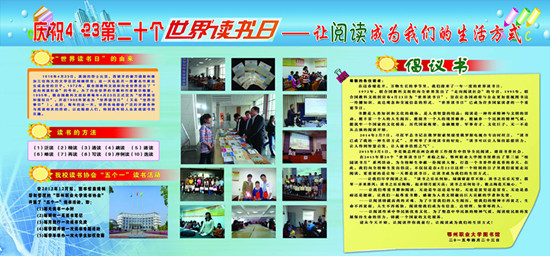 在2015年第20个“世界读书日”来临之际,鄂州职业大学图书馆推出了第三届“校园读书月”系列活动,为全校师生奉献一份阅读大餐,打造一个书香伴着花香的春天。在此,我们向全校师生发出倡议,不仅仅是在4月23日这样一个特别的日子里我们需要走近阅读,更重要的是让每一天都是读书日,让读书成为我们的生活方式。