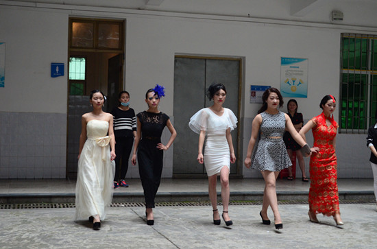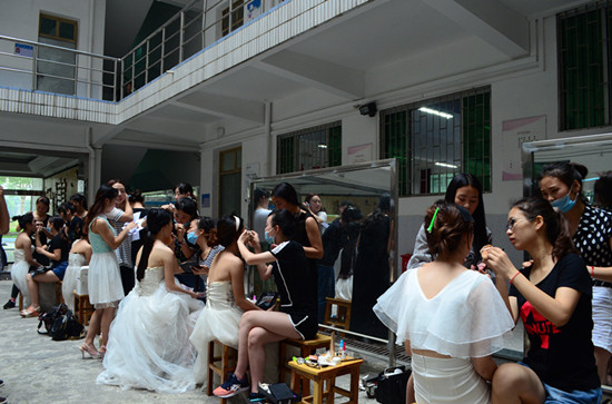 比赛分为“妆面与造型、模特走秀、作品描述”三个环节,参赛学生分为13组,每组4人,其中1人为模特,另外3人在45分钟内为模特上妆、30分钟内为模特做造型。