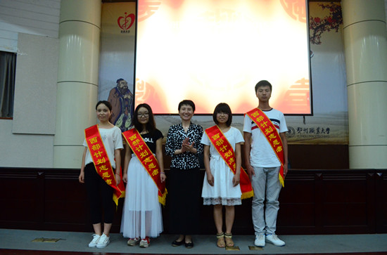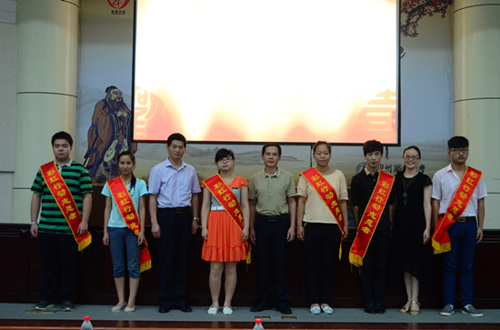 会上为寒假社会实践优秀指导教师和优秀个人进行了颁奖,校党委副书记、副校长周岫为西部计划志愿者代表和“彩虹行动”支教志愿者颁发了绶带。