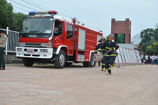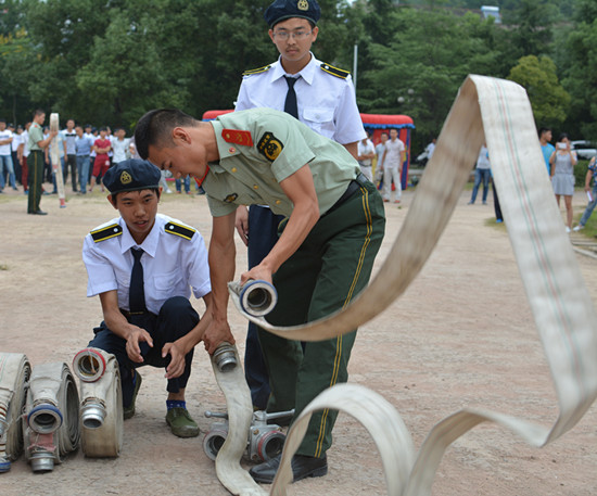 建筑物内火灾逃生演练结束后,消防官兵向新生们讲解了相关安全逃生知识,现场演示了灭火器、水带连接等消防器材的使用方法,并让几十名新生现场亲身实践了消防器材的使用。
