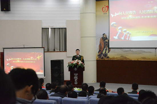 本网讯(学生记者 王俊 李群英 黄蓉蓉/文周智慧/摄)11月25日上午图书馆二楼学术报告厅,湖北省消防部队先进事迹巡回报告会走进我校,与数百名师生及消防官兵们共同分享了向火而行背后,关于责任与爱的故事。