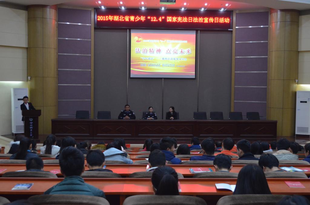 本网讯(学生记者宋显峰 葛胜男/文吴金辉/摄)12月4日,由共青团湖北省委主办的2015年湖北省青少年“12.4”国家宪法日法治宣传日主题活动走进我校。
