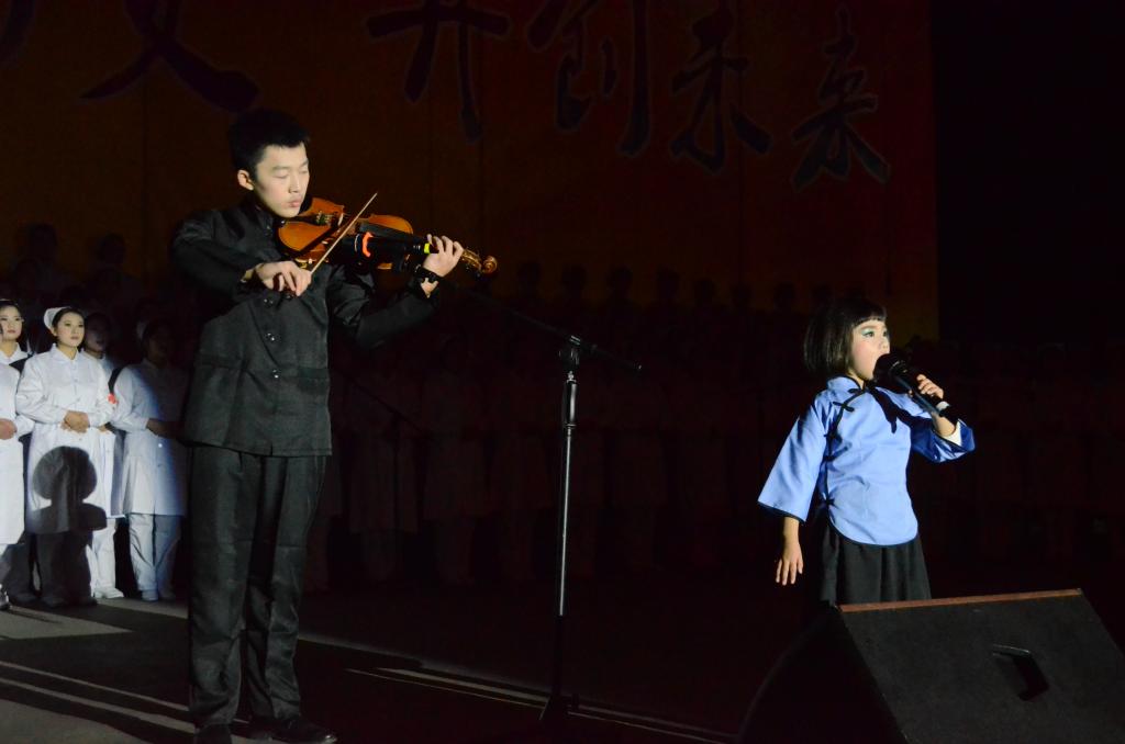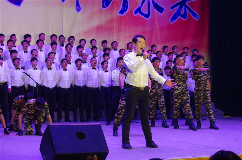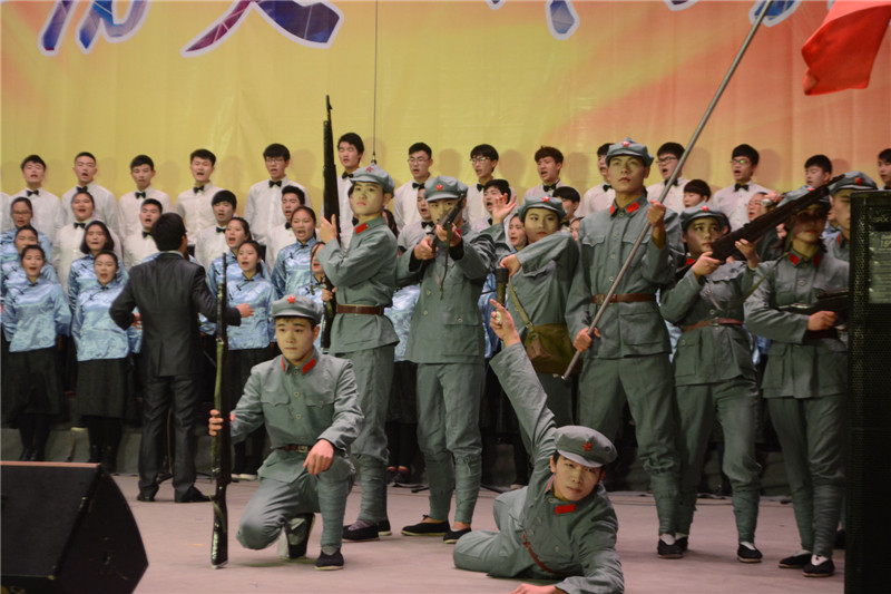 电子电气工程学院的同学们一身红衣,旋律激昂、振奋人心的《强军战歌》体现着当代军人的气势;机械工程学院的同学们身着迷彩服,伴着《渴望光荣》、《山丹丹开花红艳艳》的合唱,舞蹈刚健有力;服装与艺术学院的同学们不断挥舞着手中的党旗,手持冲锋枪将《四渡赤水出奇兵》演绎的唯妙唯俏。