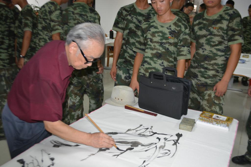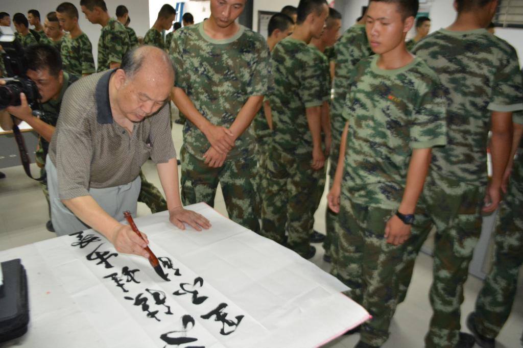大师挥毫泼墨,抒发着热爱人民军队的浓浓情怀,官兵们研墨牵纸,呈现着为国为民个腔腔热血,现场欢乐融融,情深意长。