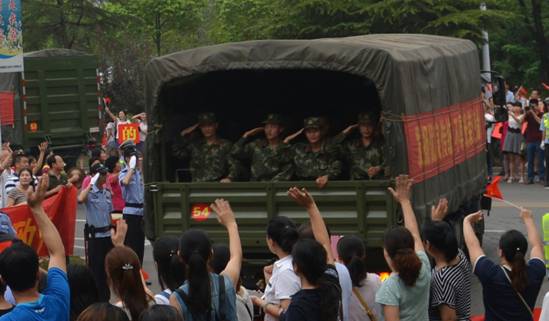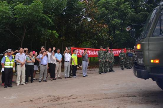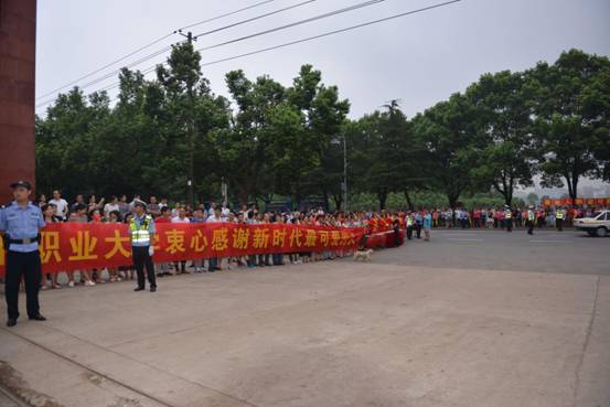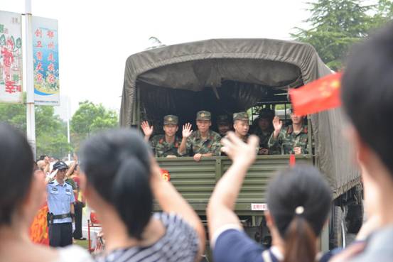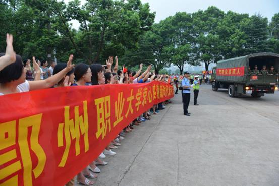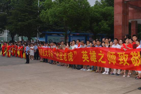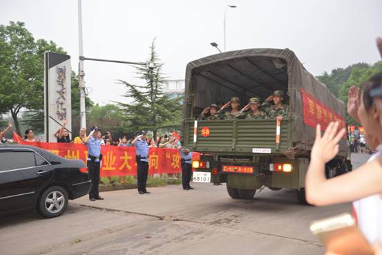本报讯(记者 宣葶/文、摄)武警8680部队驰援我市抗洪抢险已一个月,随着抗洪抢险任务的圆满完成和全市防汛压力的缓解,驻扎在我校的武警8680部队也即将开拔。8月6日清晨,我校近千名教职工早早等候在了校门口周围和主干道两侧,拉起横幅、挥舞着国旗、敲起威风锣鼓,带着满怀的热情、谢意与不舍,欢送这些守卫了一方平安、造福了一方百姓,可敬可爱的人。