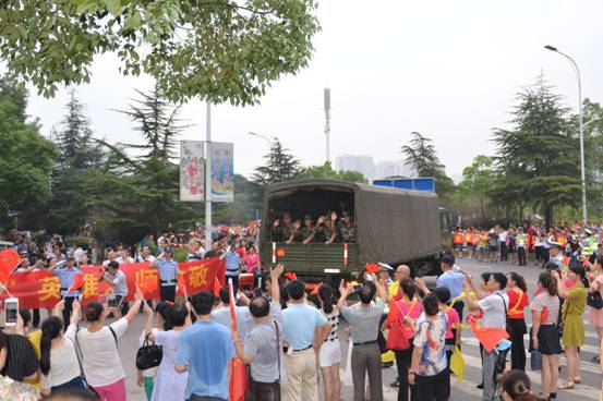 ▼清晨5点半,天蒙蒙亮,早已等候在校门口和各主干道周围的我校教职工,以及自发前来送别的市民,翘首以待