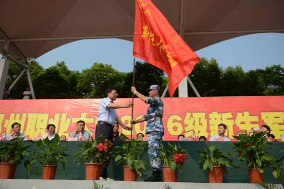 校党委书记杨植涛向新生军训团授旗,为期14天的16级新生军训正式拉开帷幕。