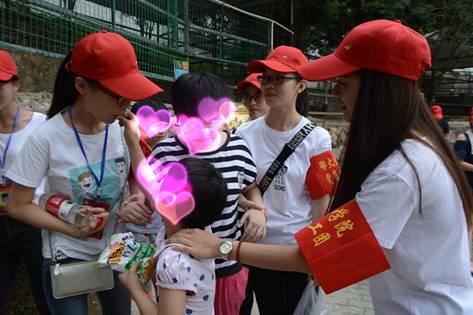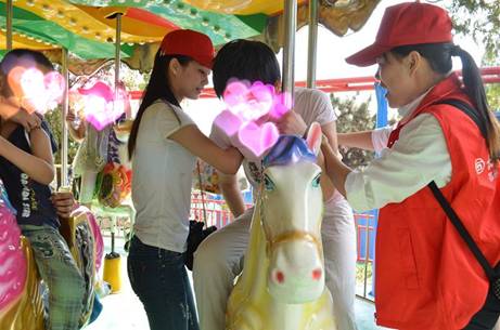 在义工团学生志愿者和景区工作人员的细心引导下,孩子们不仅看了动物园,玩了摸心台,在游乐场里玩了海盗船和旋转木马,一路上还有“哥哥”“姐姐”们牵着手喂好吃的。