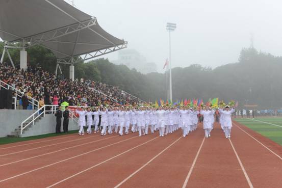 伴随着运动员进行曲,各院系运动员着光鲜艳丽的统一服装,喊着高亢嘹亮的口号,迈着铿锵有力的步伐在主席台前一一亮相,展现出大学生们特有的精神风貌。