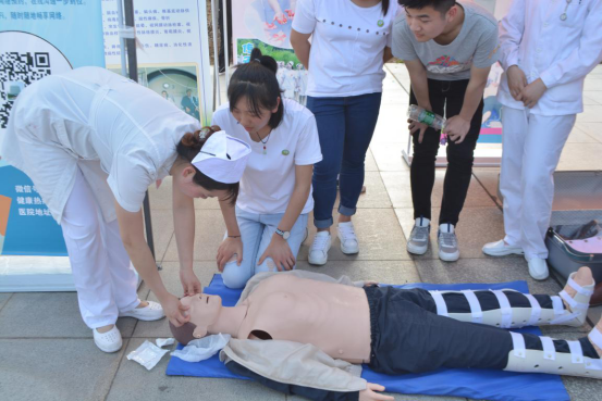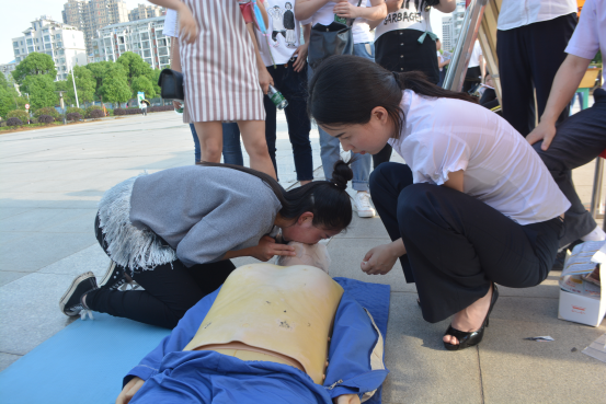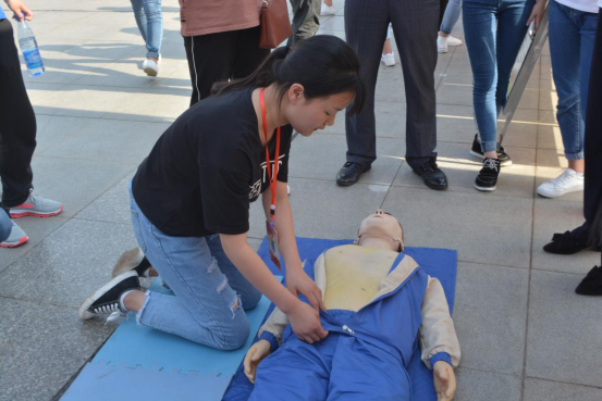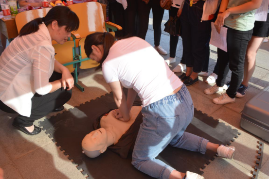 活动中,医护人员现场指导参与活动的学生正确实施心肺复苏、人工呼吸等紧急救援技能。
