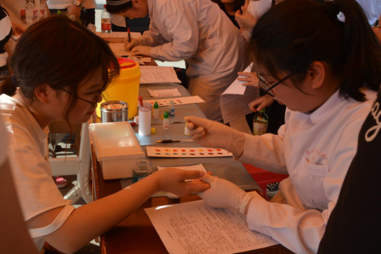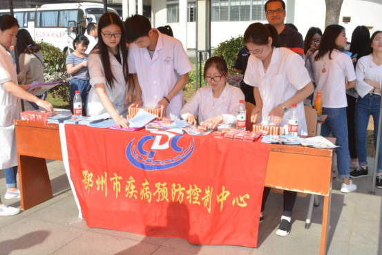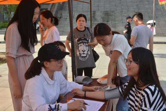 现场还设有献血、艾滋病防治、结核病预防、血吸虫防治等知识宣传站点,不少学生在献血咨询点排起长队,挽袖献血。