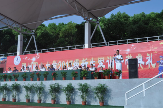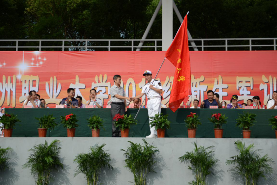 校长洪贞银向新生军训团授旗,为期14天的17级新生军训正式拉开帷幕。