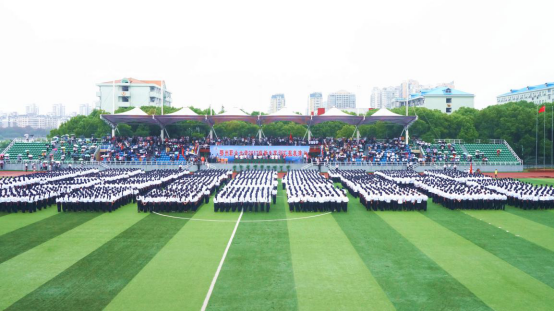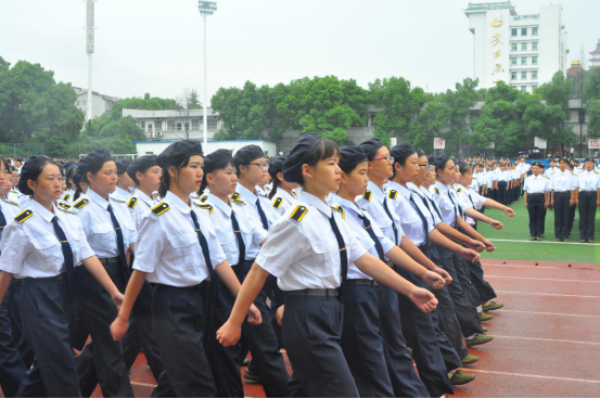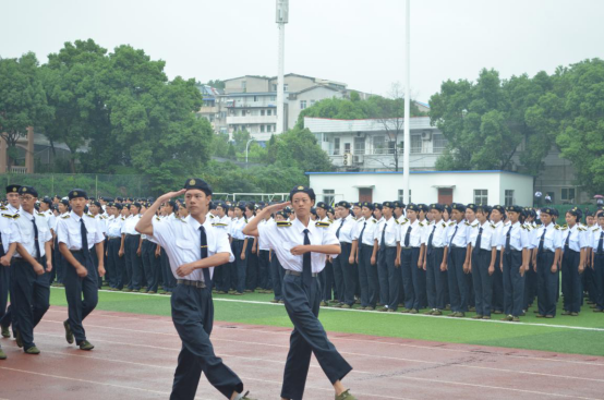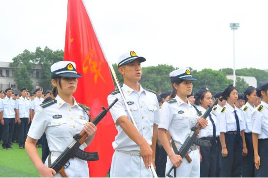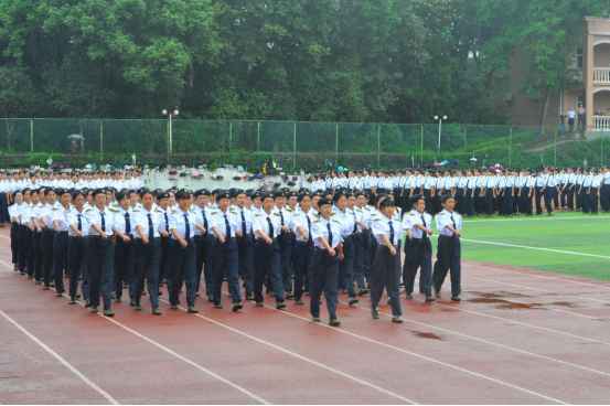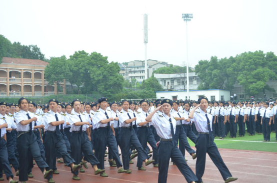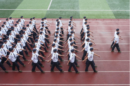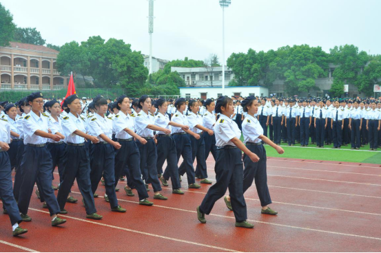 随后,全体军训新生在《中国人民解放军进行曲》的节拍中,踏着整齐的步伐、喊着嘹亮的口号,齐步换正步、正步换齐步依次走过主席台,接受全体师生、教官们的检阅。