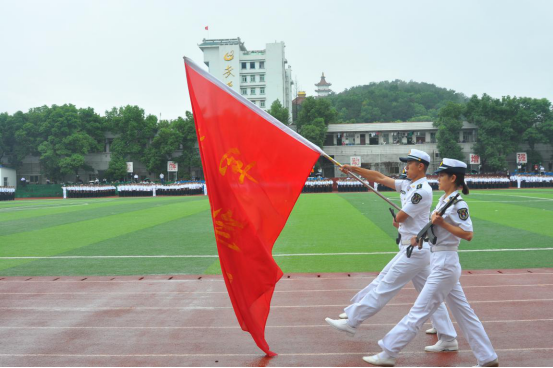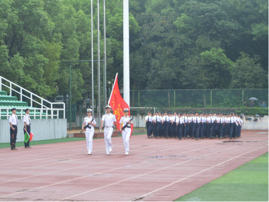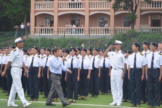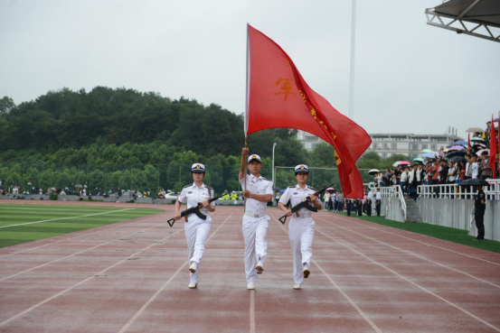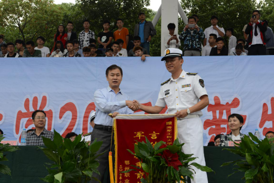 ▼校长洪贞银向海军工程大学授锦旗、检阅军训方阵
