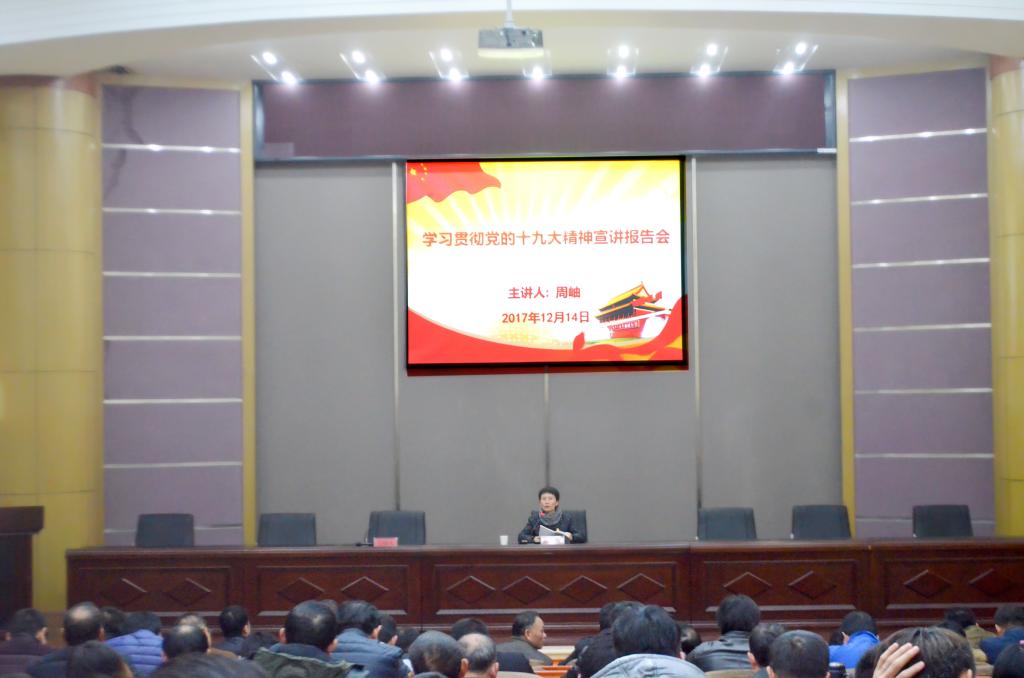 周岫从“十九大盛况和成果”、“我们鲜明的旗帜”、“新时代、新思想、新判断、新方略新在哪里,丰富的内涵是什么?”“十九大报告十三个部分主要的精华和我们如何解读”等四个方面做了一个系统全面、准确精彩的宣讲报告。