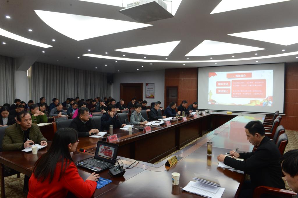 思政课部吴寒梅老师为全体与会人员作《中华人民共和国宪法修正案》辅导报告,她从宪法简介、宪法修改的必要性、宪法修正案的具体内容等三个方面对该法案进行了全面解读。