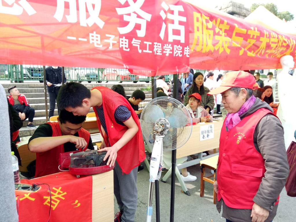 本网讯 (记者 刘彦)3月22日,我校电子电气工程学院、医学院、服装与艺术学院的数百名青年志愿者走上街头,并在我校西区门口支起雨棚,为市民提供免费的小家电维修、衣服缝补及爱心衣物捐赠、康复理疗、测量血压血糖、健康知识宣传等服务,广受市民好评。
