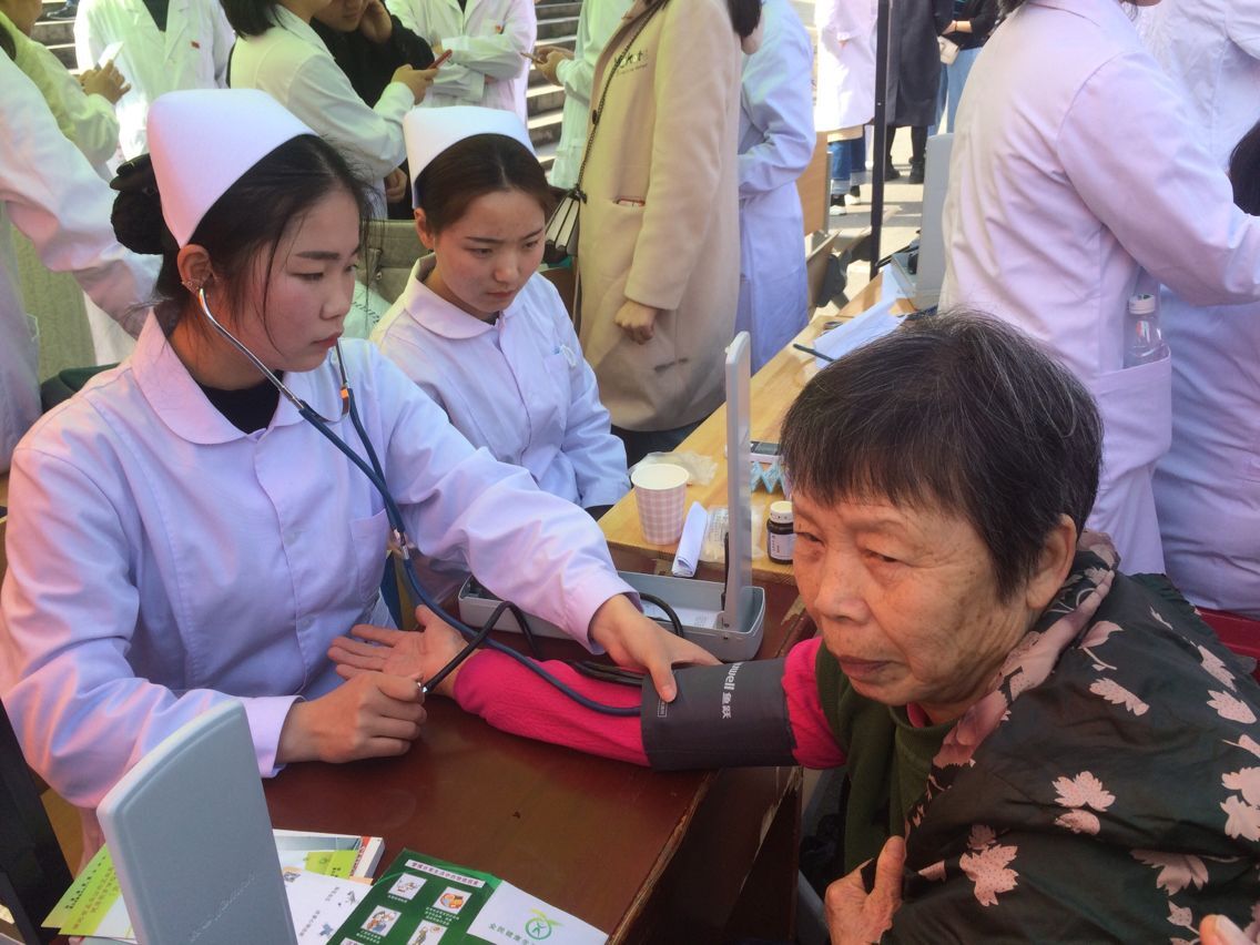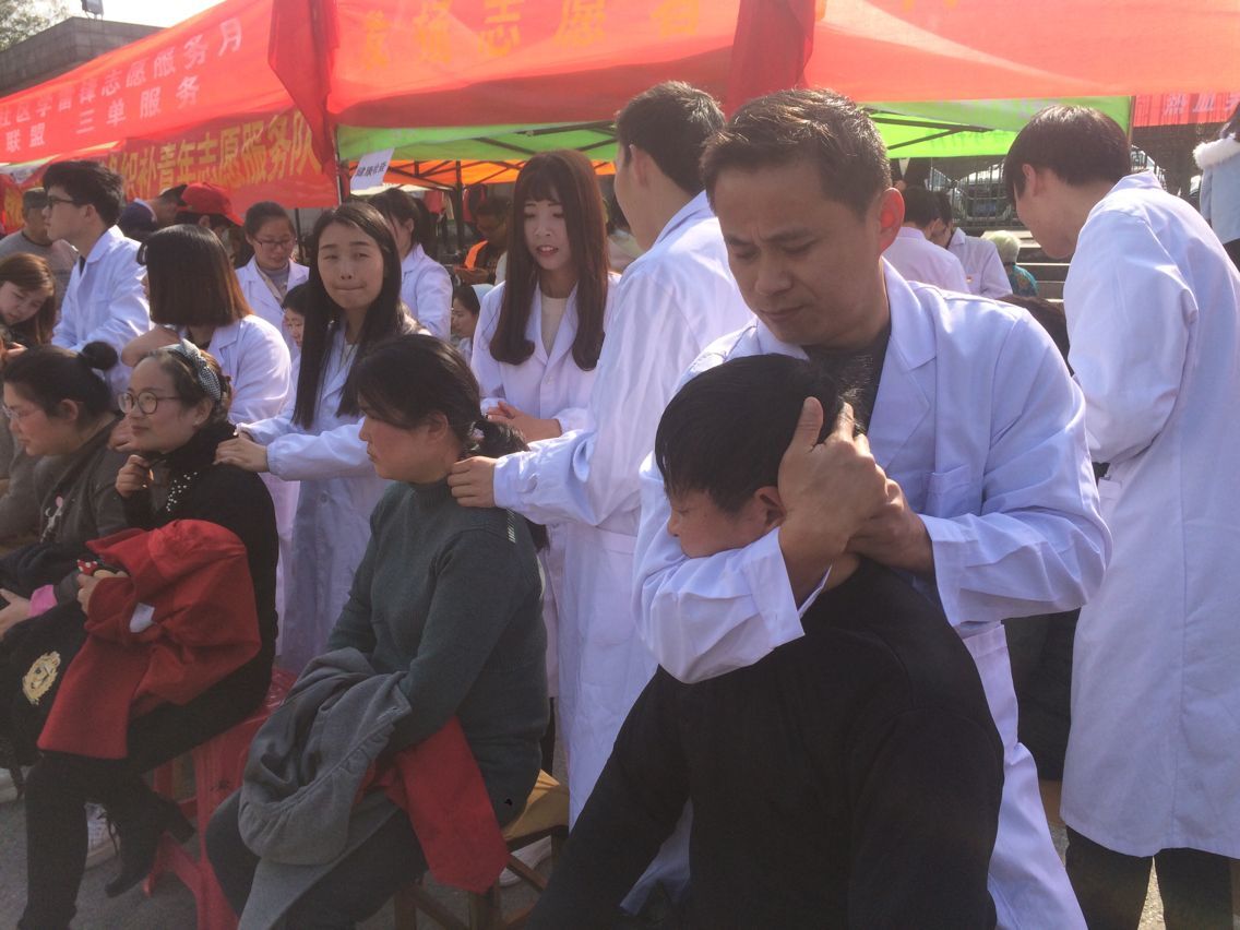一字排开的椅子上早已坐满了前来理疗的市民,我校医学院的教师和学生用熟练的手法帮他们按摩颈椎、背部和头部。现场的一部分志愿者还为市民测量血压、血糖、宣讲健康知识。