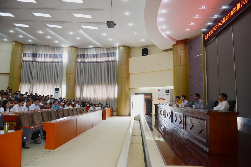 本网讯 (记者 刘彦/文 宣葶/摄)6月29日,校党委理论中心组举行2018年第八次集中学习,校长洪贞银为全校副科级及以上党员干部、各支部书记、各级党组织组织委员、离退休党员代表讲党课。