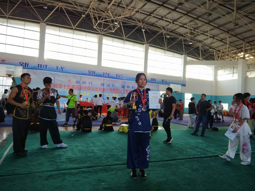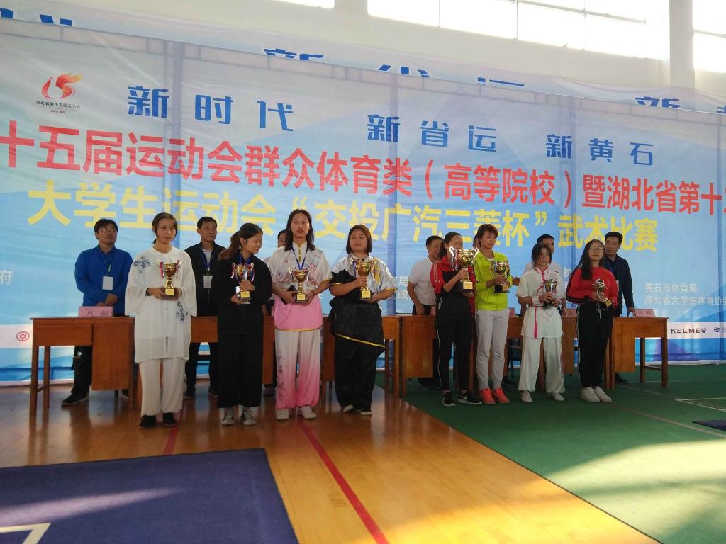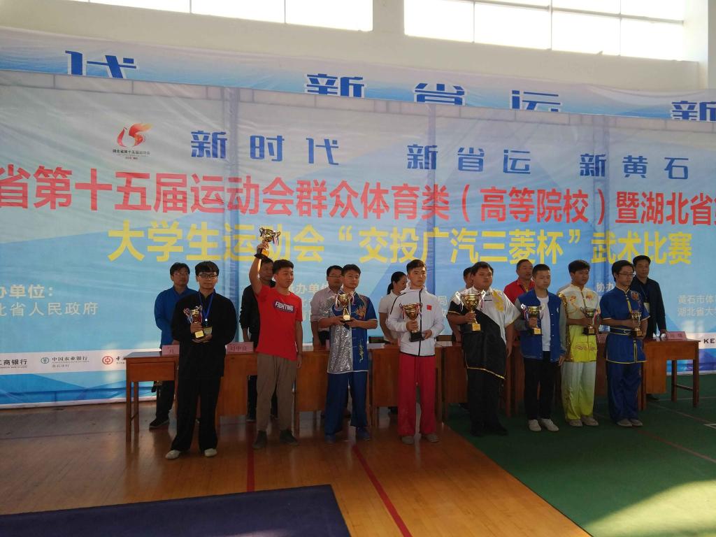 本网公共体育课部消息 10月9日-11日,湖北省第十五届运动会群众体育类(高等院校)暨省第十二届大学生运动会武术类比赛在湖北师范大学举行。我校武术代表队的10名运动员夺得2金、2银、2铜以及男子团体第四、女子团体第五的优异成绩,另有1人荣获“精神文明运动员”称号。