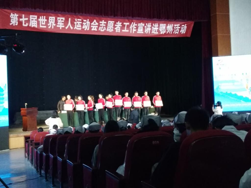 本网讯 (学生记者 阮班丽 彭丹/文 彭杰 彭丹/摄)11月17日上午,“第七届世界军人运动会志愿服务工作宣讲”进鄂州活动在我校大学生活动中心举行。武汉军运会执委会志愿者部副部长朱海林、副市长程少云、校长洪贞银出席活动。