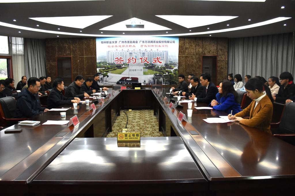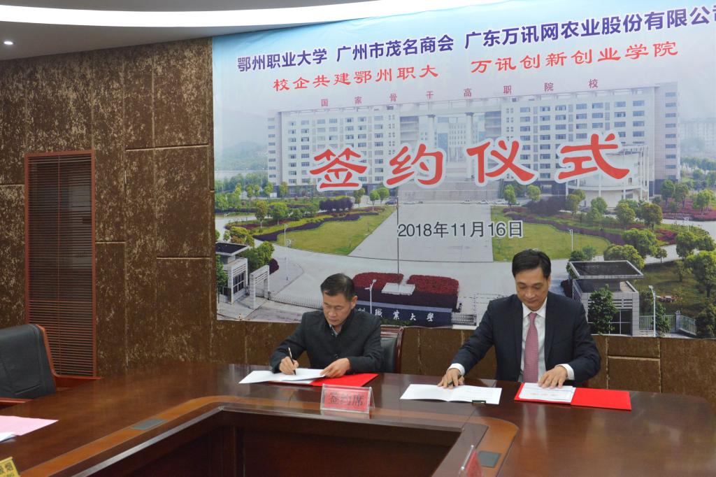 本网讯 (记者 何建华)11月16日校图书馆一楼会议室,我校与广州市茂名商会、广东万讯网农业股份有限公司举行“鄂州职大•万讯创新创业学院”签约仪式。校长洪贞银,广州市茂名商会会长、华茂集团、万讯集团、七子集团董事局主席陈庆南代表双方签订了共同开展创新创业教育合作框架协议。“鄂州职大•万讯创新创业学院”的正式签约,标志着“政校行企•万讯创新创业学院高校联盟”已达18所。