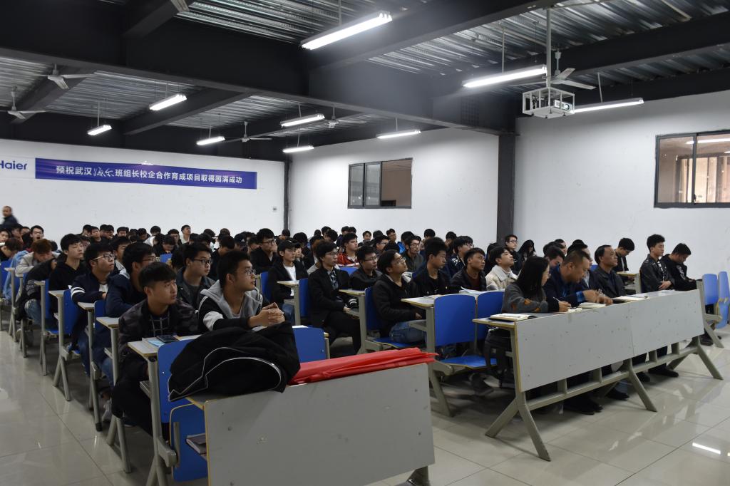 海尔集团代表详细介绍了海尔班组长项目体系的合作模式、项目优势及培养方案,并来到教室,就“班组长校企合作育成”项目与学生进行面对面交流。现任武汉空调互联工厂质量平台技术员、我校17届优秀毕业生龚腾蛟,还现场与学弟学妹们分享了自己的职业成长历程。