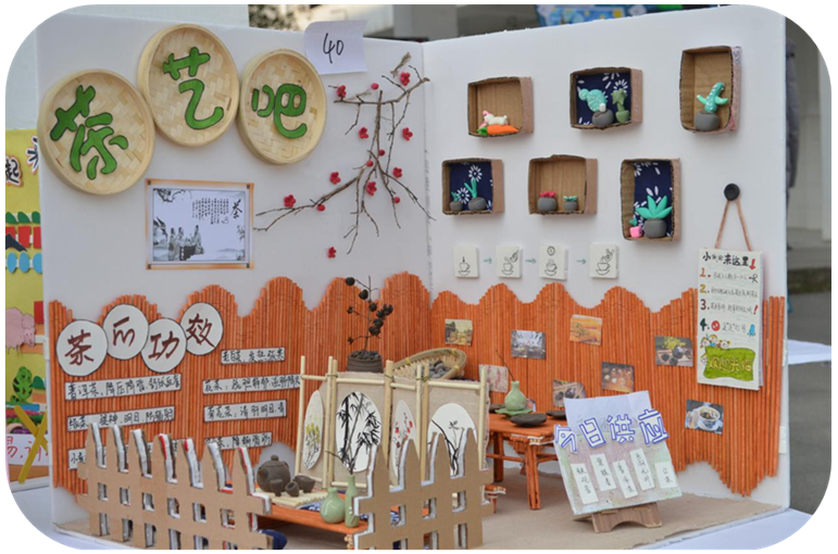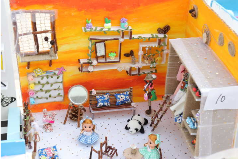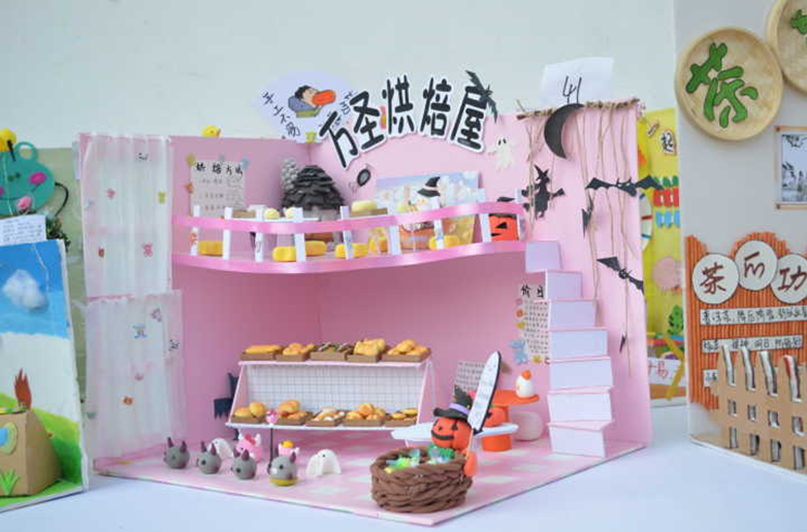 与传统的美术作品展不同,除了40余件书法和绘画作品,100余件手工小剧场模型成为了本次展览中的一大亮点。手工小剧场有模拟家居生活场景的,有模拟面包店的、茶艺吧的……模型中身份各异的人偶,树枝做的家具,手工制作的衣服和彩泥捏制的鞋子,超轻粘土捏制的面包、植物等等,无不俏皮可爱,栩栩如生,不仅极具观赏性,而且可激发幼儿的探索兴趣和动手能力。