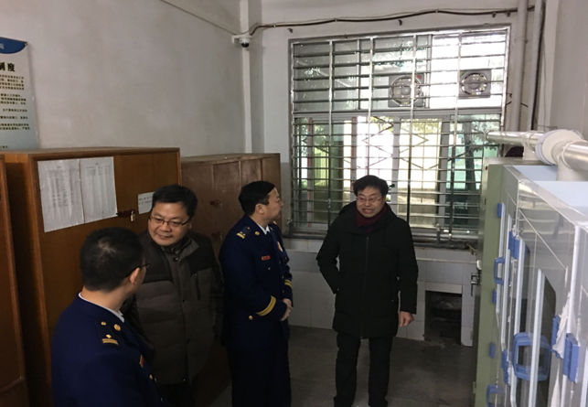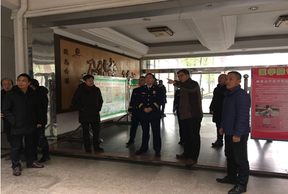 本网讯 为切实做好我校冬季火灾防控工作以及危险品储存工作,2019年1月4日上午,鄂州市消防支队王瑞支队长一行四人来我校进行消防安全检查,胡海平副校长带领保卫、教务、学工、后勤等相关领导陪同检查。