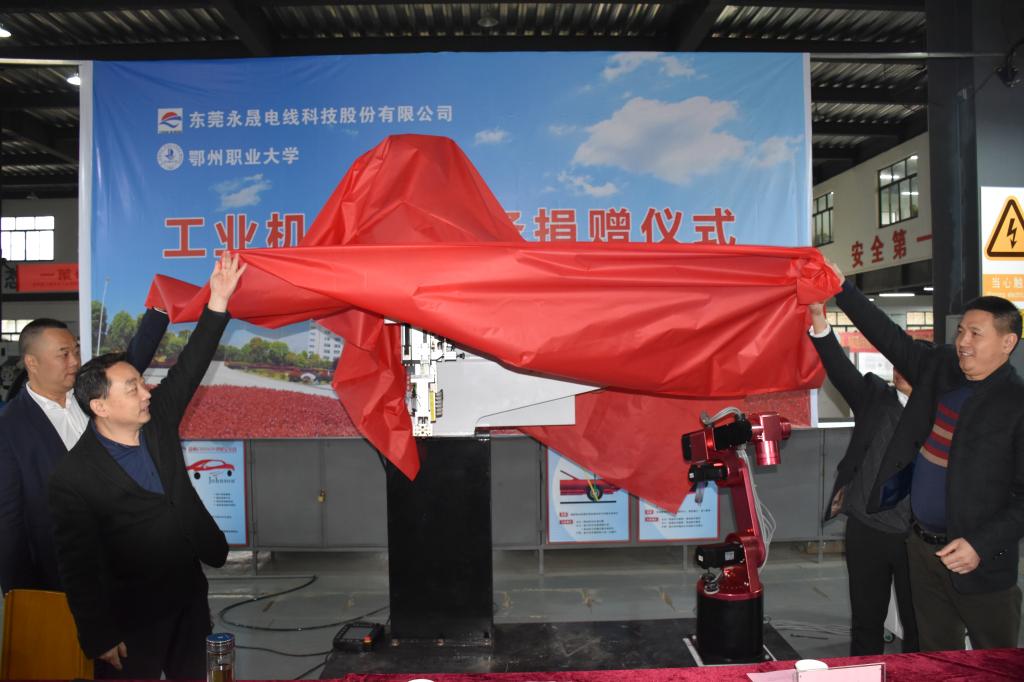 本网讯 (记者 何建华/文 双全/摄)3月1日,东莞永晟电线科技股份有限公司向我校捐赠一套工业机器人设备,用于学校工业机器人等智能制造相关专业校内实训。