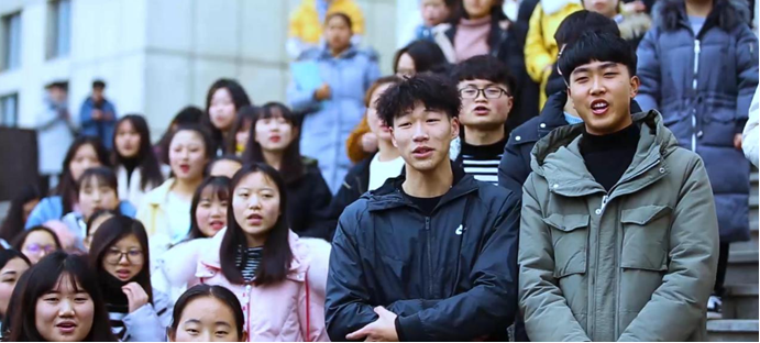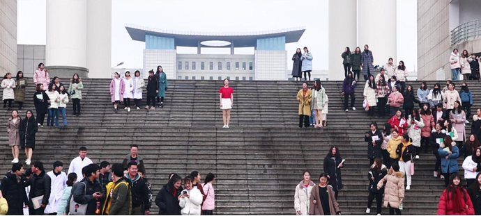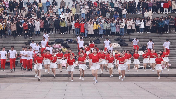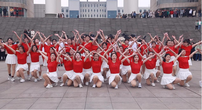 突然,一群学生脱掉外套,奔向广场,红白相间的服装瞬间引爆现场,在这初春微寒的日子里,他们像火焰般热情,像阳光般温暖,他们用铿锵的舞蹈带动现场所有的观众,他们用明媚的微笑,展示了当代大学生青春的风采。
