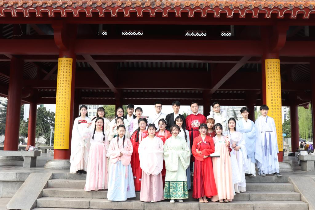 本网讯 (学生记者 邓子涵/文 张红莲 赵翠梅/摄)3月23日下午,我校汉服文化协会20余名成员身着汉服齐聚凤凰广场,踏青游览,赏花祈福,庆祝一年一度的花朝节。