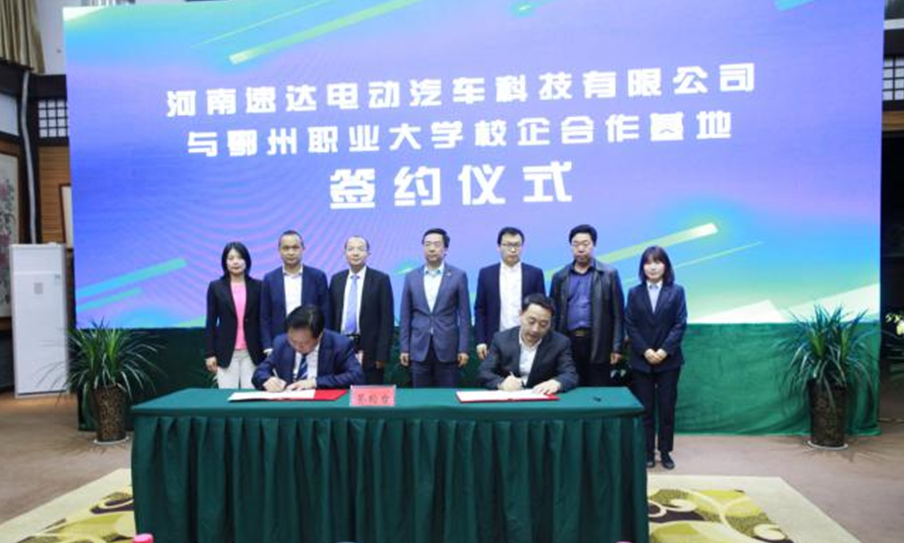 周峰与李复活签订“校企合作协议”,并为“湖北鄂州职业大学—河南速达电动汽车科技有限公司校企合作基地” “新丝路上的蓝色集装箱文化教育交流中心”揭牌。