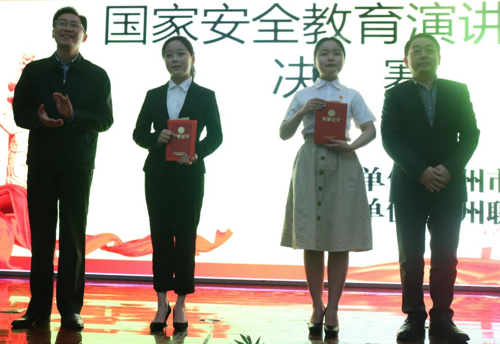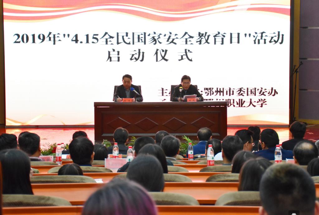 本网讯 (学生记者 文倩/文 张红莲 胡银虎/摄)4月15日,是第四个全民国家安全教育日。当晚7时,由鄂州市委国安办主办、鄂州职业大学承办的2019年“4.15全民国家安全教育日”活动启动仪式在我校5号教学楼学术报告厅举行,现场还举行了国家安全教育演讲比赛(决赛)。市委常委、市委秘书长、市委国安办主任麻琦,校长周峰及市委国安委成员单位相关负责人出席活动。