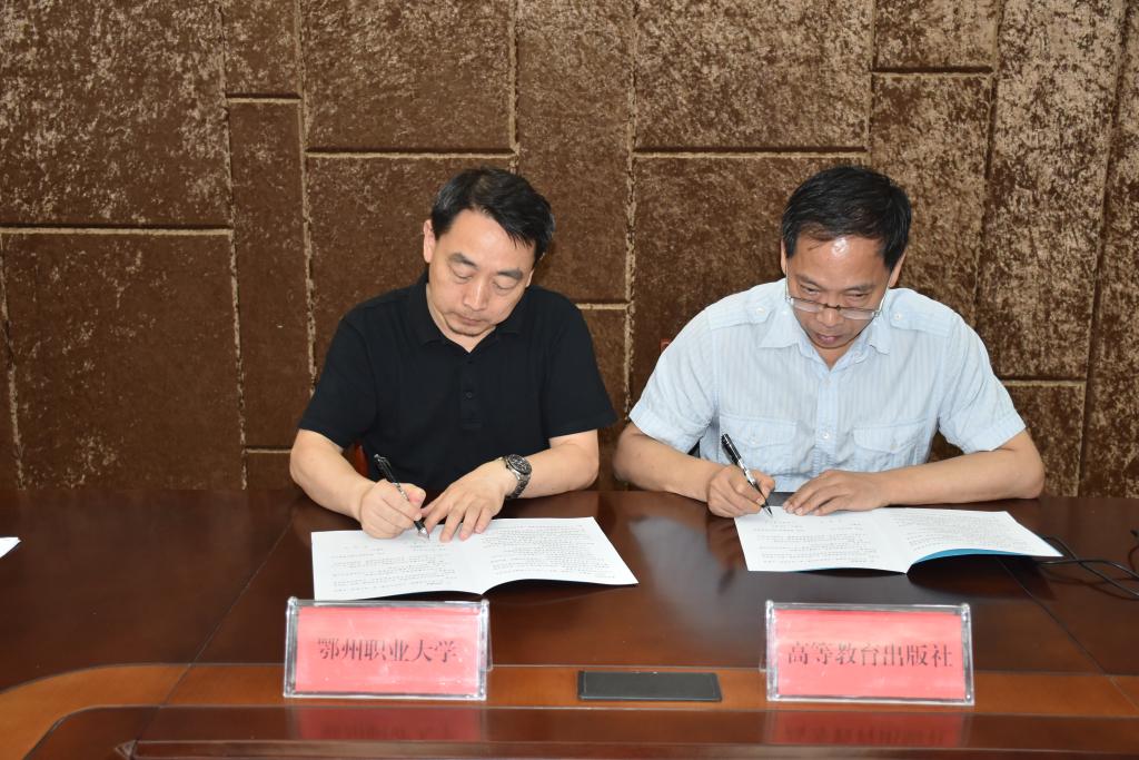 本网讯(记者 何建华/文 双全/摄)6月26日,我校与高等教育出版社战略合作协议签约仪式在图书馆一楼会议室举行。校长周峰与高等职业教育事业部主任徐刚代表双方签订合作协议书。高等职业教育事业部副主任段博原、华南区教学服务中心主任张怀福出席,副校长杨殿生主持仪式。